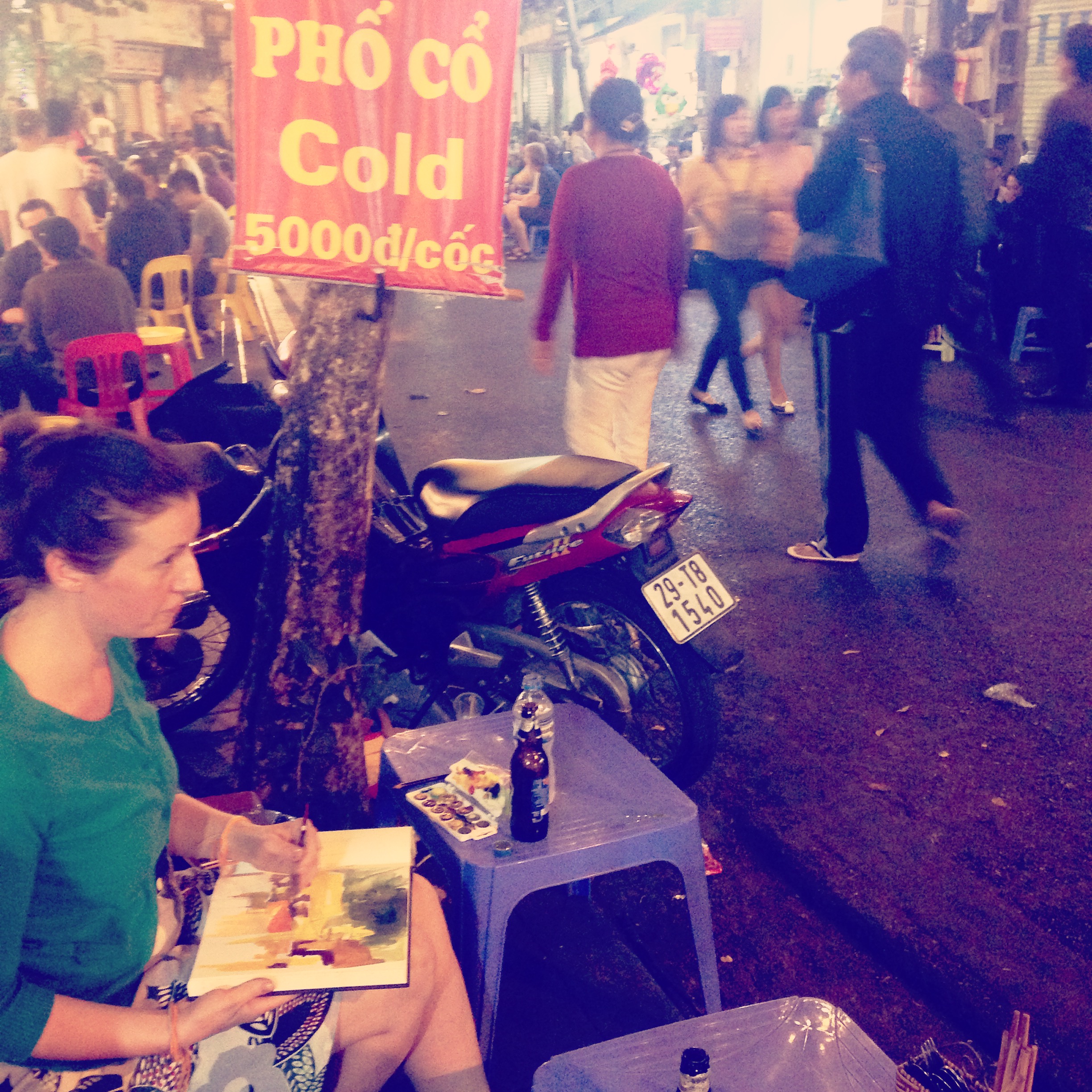 So far... We visited family in Northern Laos then traveled down the Mekong in a slow boat to Luang Prabang, where we hung out with old friends and ate Laos BBQ pretty much every day. In Vietnam we walked and walked and walked.... our legs ached after walking the perimeter of west lake. We stumbled across Chinese styled temples and got lost in the jumbled buildings of the old town, we ate fantastic steet foods and drank the cheapest beer ever at 25p a glass. From Hanoi to Hoi An... where it rained for 3 days and the town flooded so much that we had to leave our hotel in a boat. We escaped to Da Nang which is a neon city at night and has a Dragon brigde who's party trick is to breath fire. Final destination in Vietnam, Halong Bay.. the sun didnt shine but the cloudy sky and mist added an eerie atmosphere. My sketchbook has been keeping me company and its already half full. Still another 3 weeks left to discover and draw Thailand. Hopefully it won't rain anymore....