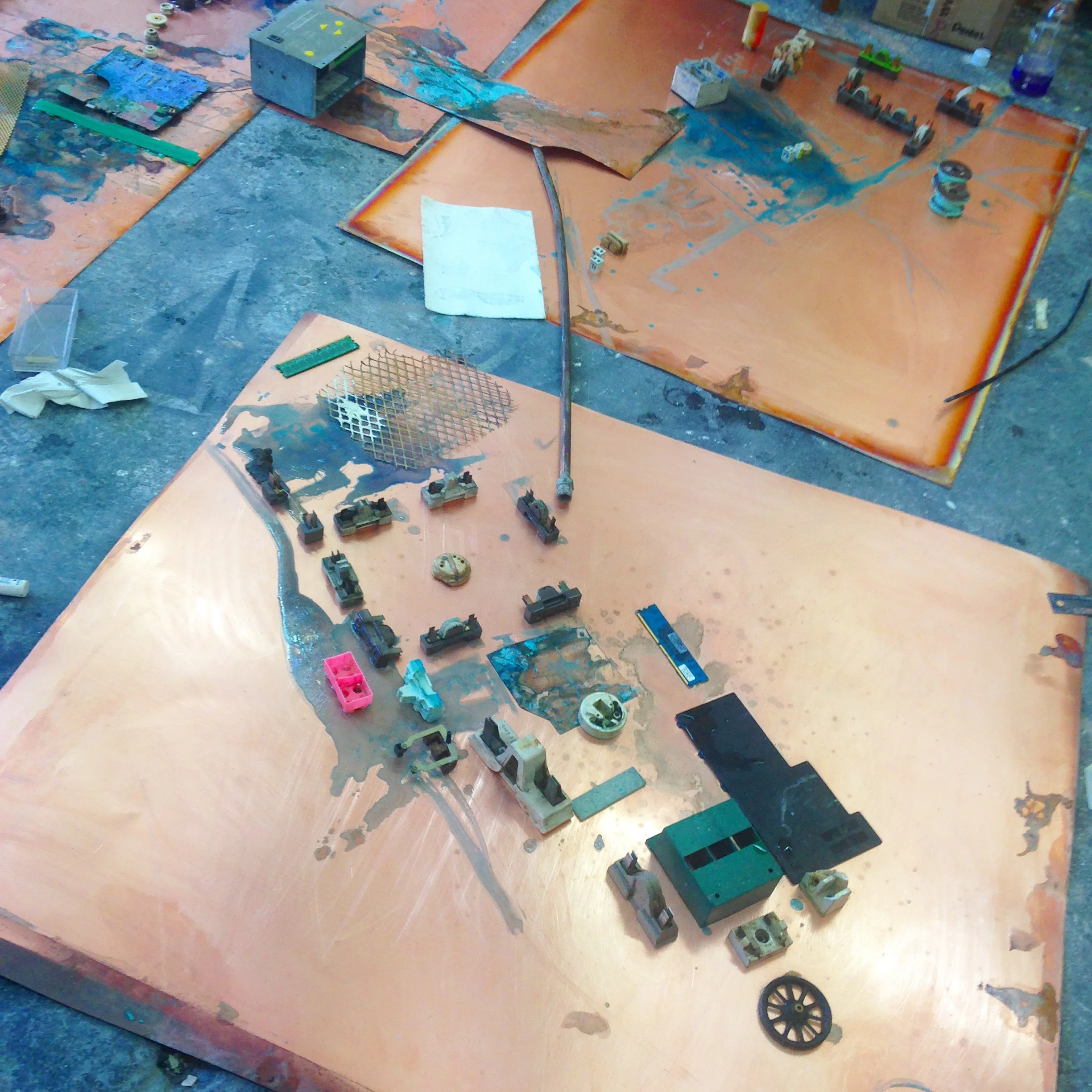 Dipping old electrical ceramic fuses, insulators and other found objects into various strengths of ammonia, vinegar and salt before placing them onto copper sheeting to stamp an impression of the object. The varying strengths of ammonia and vinegar create colours ranging from earthy brown, deep veridian and brightest turquoise. The objects themselves create marks reminiscent of the city from above, hinting at Portobellos' long lost buildings; the power-station, the open air pool and the Marine Gardens. Watch this space.....